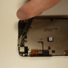 Бережно оттяните экран, одновременно отделяя его от задней части корпуса HTC T320e One V, но в то же время продвигайте сквозь отверстие контакты SIM-карты и коннектора карт памяти SD. Здесь придется немного повозиться, но действовать нужно максимально осторожно.