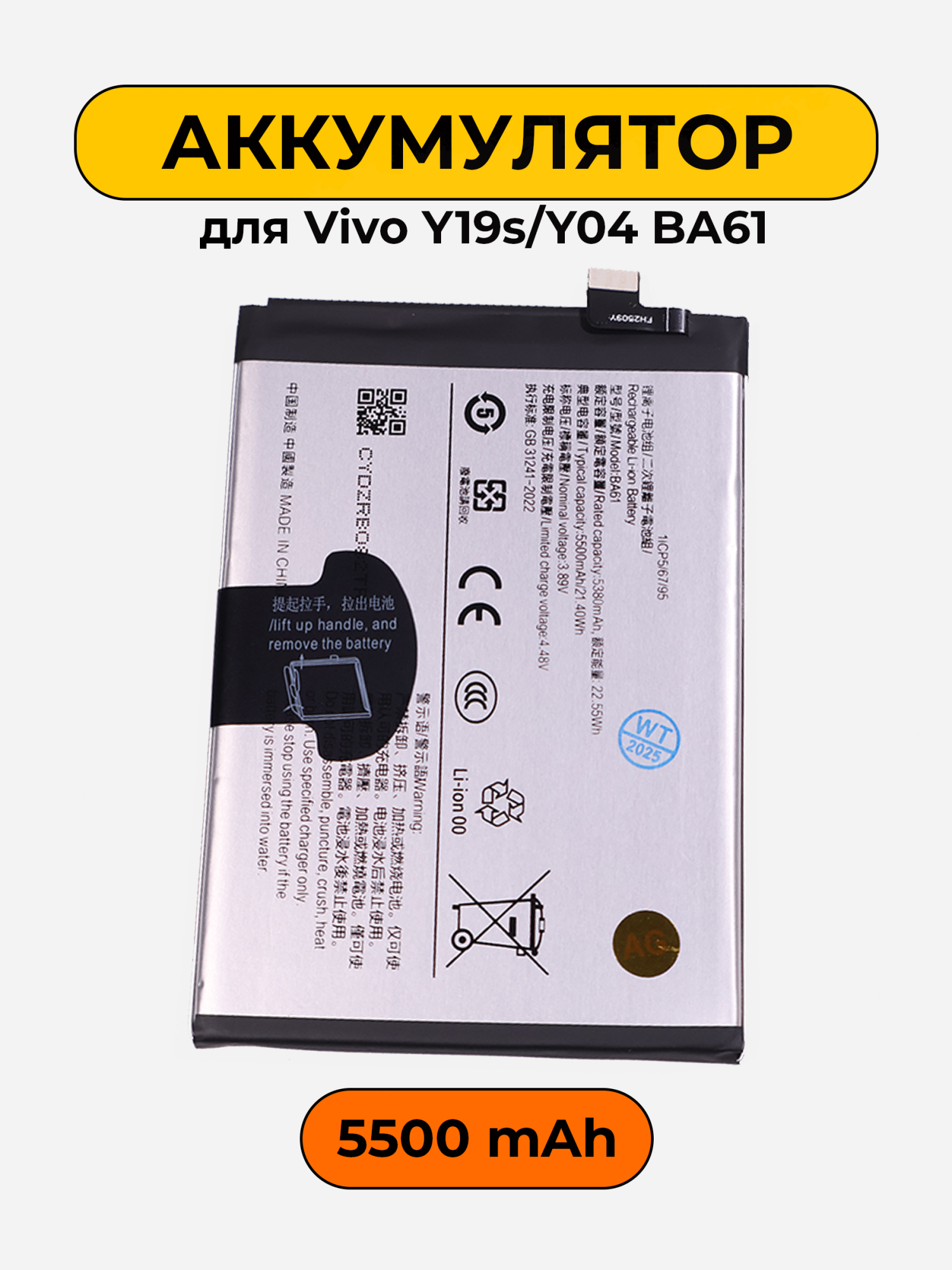 Аккумулятор для Vivo Y19s/Y04 BA61 с емкостью 5500mAh является идеальным решением для замены или обновления работы вашего устройства. Этот аккумулятор обеспечит надежное и длительное питание, позволяя вашему смартфону работать с максимальной производительностью. Высокая емкость гарантирует, что вы сможете наслаждаться всеми возможностями вашего телефона без необходимости частой подзарядки.